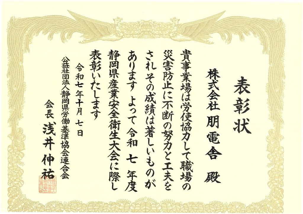 令和七年十月七日に開催された静岡県産業安全衛生大会に際し(公)静岡県労働基準協会連合会より安全衛生管理優良事業所(産業安全の部)の受賞を受け、表彰されましたのでお知らせいたします